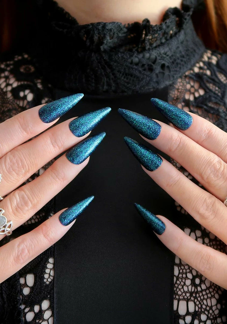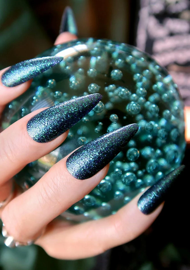 cuz youΓ’ΒΒre casting dark magic. This emerald glitter nail polish has a purple tinted base with a quick drying and chip resistant finish.