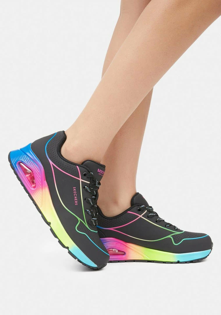 got ya walkin on cloud 9 bb! Make the city ur runway in these supa sporty sneakers with a stacked rainbow cushion sole with a clear cut out, rainbow trim, and lace up fronts.