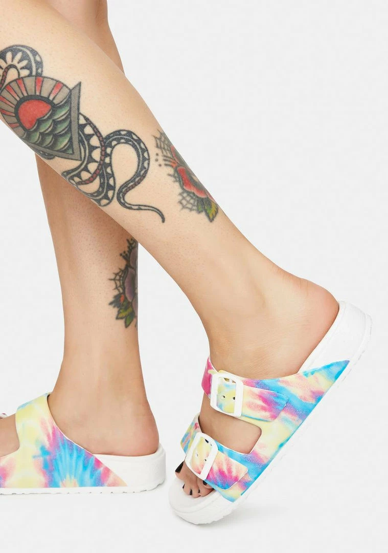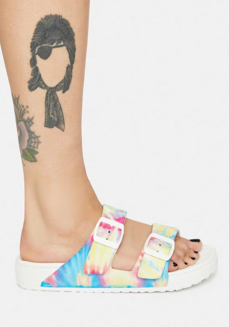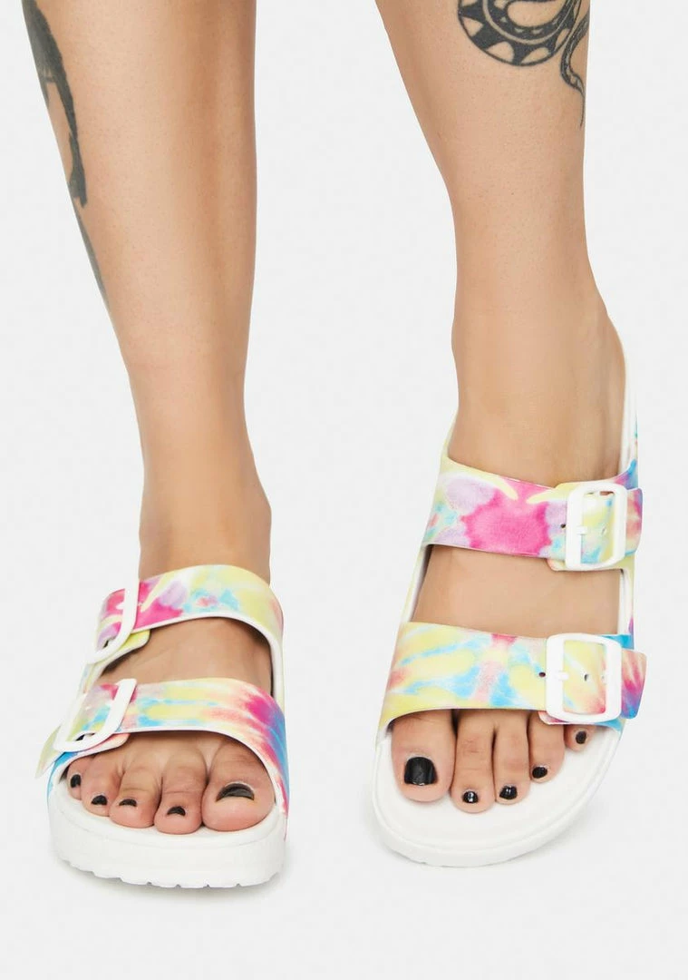 have sculpted cushioned footbeds, adjustable double buckle straps, an easy slip design, and a tie dye print.