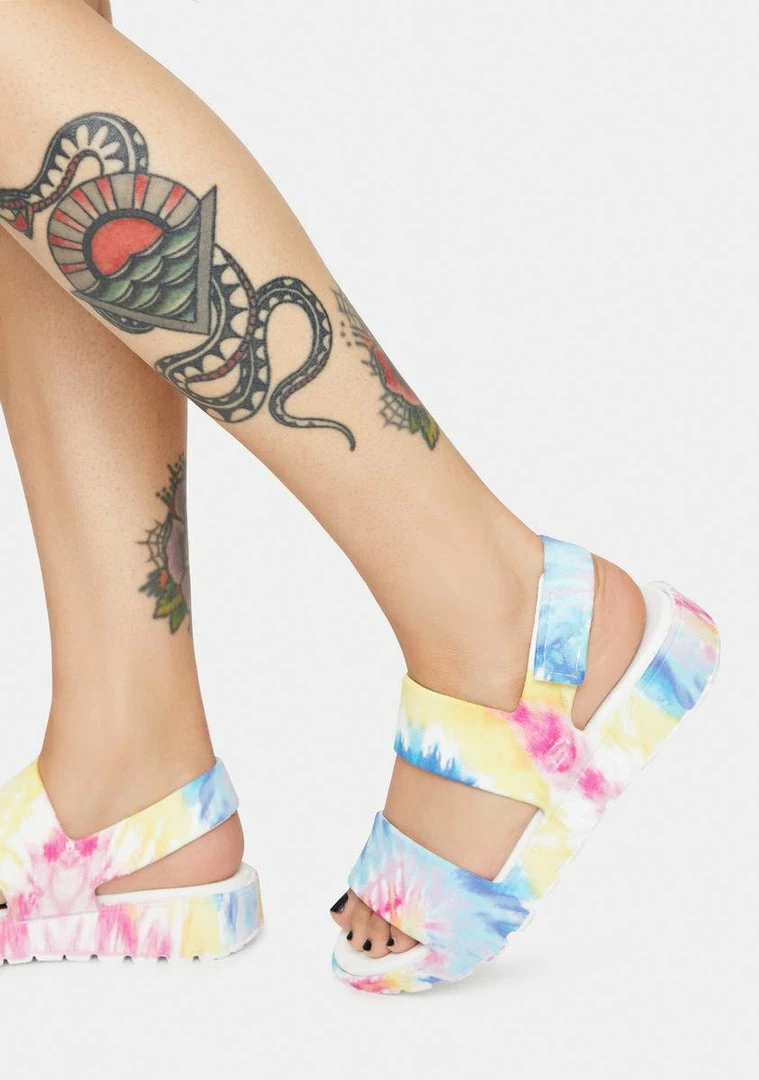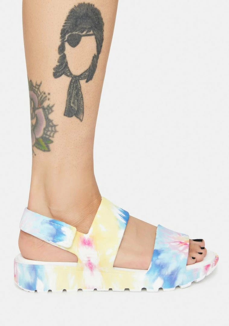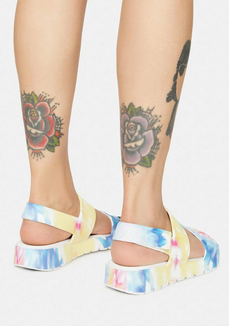 have sculpted cushioned footbeds, flexible EVA foam uppers, slingback straps with adjustable buckles, and a tie dye print.