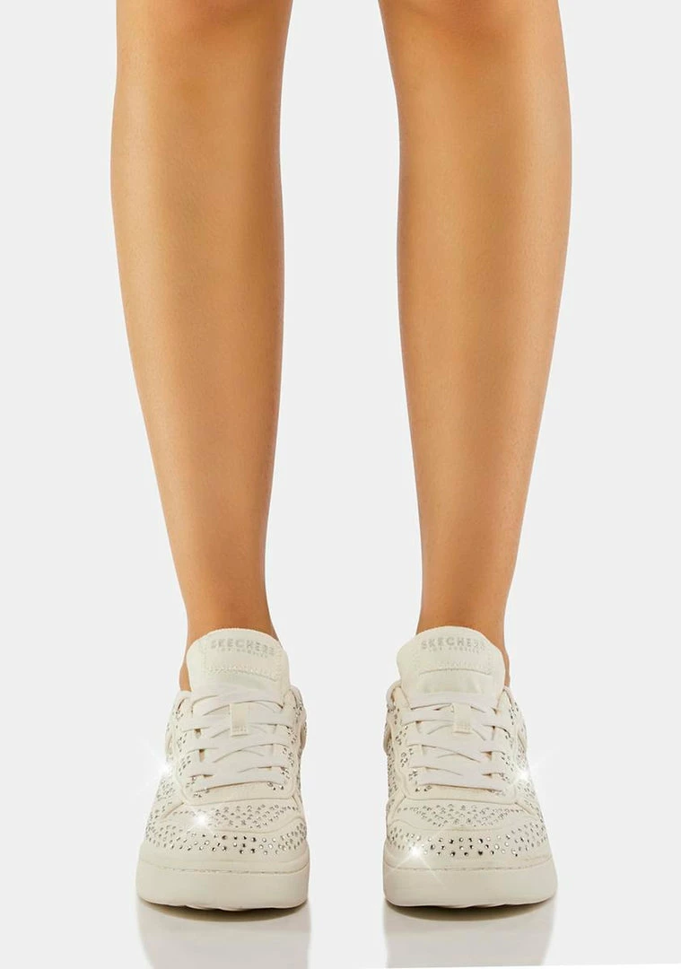 feature canvas uppers with rhinestone embellishments all over, front lace up closures, air cooled memory foam midsoles, and rubber soles.