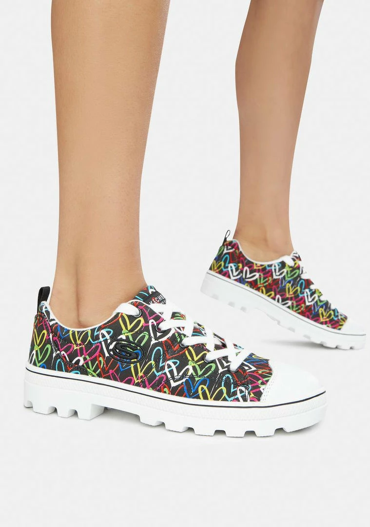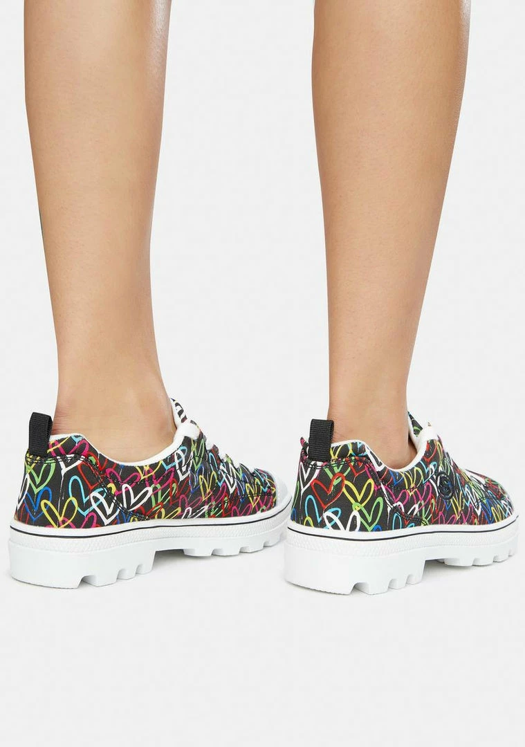 you’re moving and grooving! These casual sneakers have heart print uppers, front lace up closures, a treaded platform sole, and memory foam insoles.